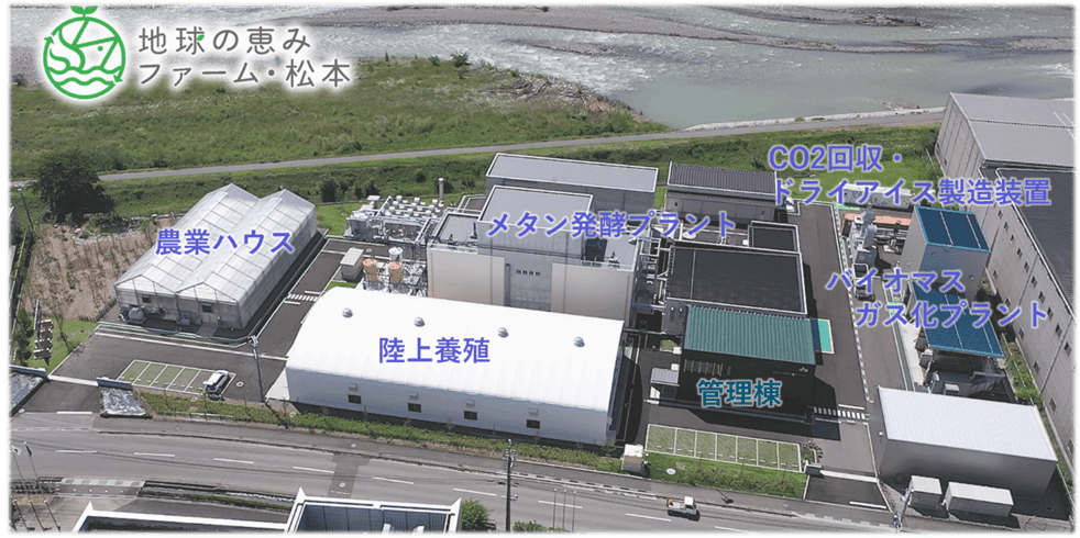 「地球の恵みファーム・松本」では、未利用資源である木質バイオマスや食品廃棄物を活用し、バイオマスガス化プラント、メタン発酵プラントでカーボンニュートラルなエネルギーを製造する。電力に変換し施設内で利用するとともにFIT(固定価格買取制度)を活用し売電する。また、養殖設備ではサーモンなどを養殖、農業ハウスではトマトなどを生産するとともに発電設備の排熱・排気ガス中のCO2を活用。さらにはCO2回収・ドライアイス製造装置(ReCO2 STATION)によりCO2からドライアイス、エネルギー製造時の廃棄物から肥料を製造する地産地消エネルギーを活用した資源循環モデルを実現する。