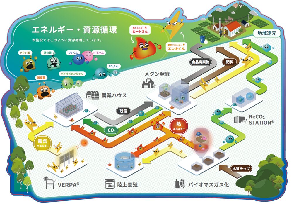 本施設は、「バイオマスガス化プラント」「メタン発酵プラント」「スマート陸上養殖プラント」「スマート農業ハウス」の4つの設備で構成される。全設備を本格稼働することで、未利用バイオマス資源を有効活用したエネルギーおよび電力の製造、熱やCO2の養殖や農業への利活用、廃棄物の製品化による資源循環モデルを実現する。さらに、本モデルを基盤として地域ごとの課題・特性に応じてカスタマイズし他地域への展開を目指す。