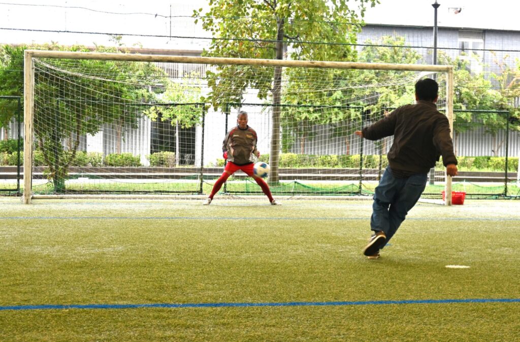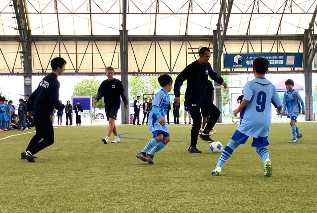 はじめに小学生チームと講師チームによる交歓試合が行われ、講師陣の本気のプレーに小学生選手たちが果敢に挑んだ。交歓試合の後は、ミニサッカー大会や保護者が景品をかけて元プロゴールキーパーに挑戦するPK 大会も行われた。また、日本酸素ホールディングスグループ会社のサーモス製品やサッカーグッズが当たる抽選会も開催され、参加した子どもたちからは「プロと対戦できてすごかった!」「また参加したい!」などの感想が寄せられた。閉会式でセルジオ越後氏は、「日頃からサッカーができる環境を整えてくれている保護者や指導者の方々に感謝しながらプレーしてください」と子どもたちにメッセージを送った。