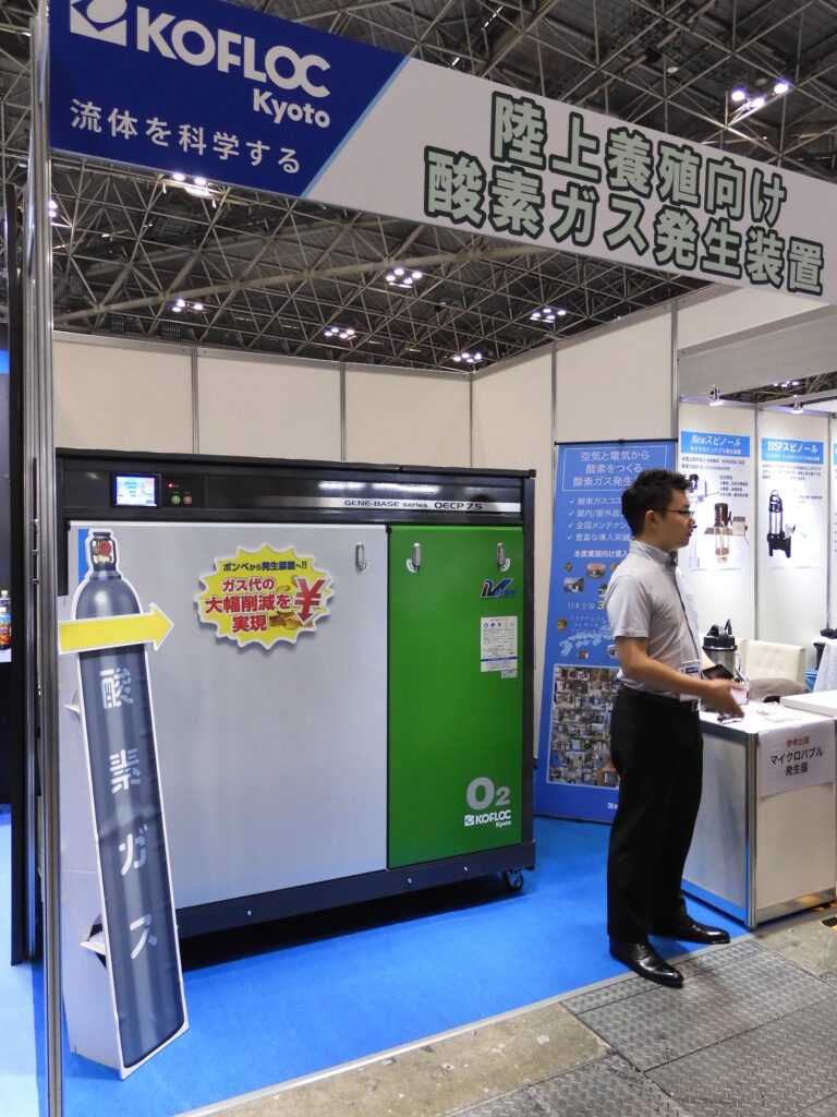 マスフローコントローラーや流量計、各種ガス発生装置を製造するコフロックは、陸上養殖向けに生簀内の溶存酸素濃度の維持に使用される屋外型の酸素ガス発生装置「GENE-BASE Series」の実機を展示した。国内水産養殖向けの導入実績は300件を超えており、ボンベや液体酸素による酸素ガス購入と、電力で空気から酸素ガスを発生させるPSA方式の「GENE-BASE Series」とのコスト比較によるガス代削減を提案した。また、エムテック製のマイクロバブルジェネレーターやマイクロバブルノズルの紹介も行った。