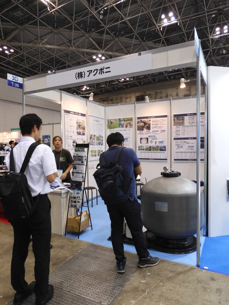 日本エア・リキードと「海水アクアポニックス」の商業化で共同研究を行うアクポニは、陸上養殖の設備としてオーストラリアの上場企業「Waterco社」の循環フィルターを実機展示した。アクアポニックスでは、魚の養殖水をろ過して排出物を微生物で分解し、植物の養分へ変換、この栄養吸収による浄化された水を再び魚の水槽へ循環させて再利用する。アクポニではアクアポニックスによる野菜栽培向けに、直接空気回収によるCO2供給を行うスウェーデンDirect Carbon社製のDAC(Direct Air Capture)ユニットの販売を開始しており、「空気から肥料をつくる新技術」としてコスト削減とカーボンニュートラルへの対応を提案した。