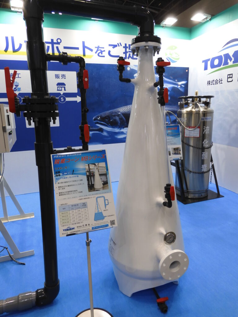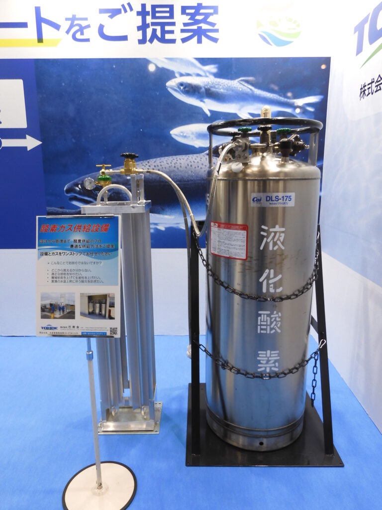 産業ガス関連業界からは、大陽日酸が三菱ケミカル、ジャパンマリンポニックス(JMP)と共同出展したほか、陸上養殖のトータルサポートを提案する巴商会、2024年に陸上養殖向け酸素曝気装置 「OXSERVE(オキサーブ)」の販売を開始した大阪ガスリキッド、ガス発生装置のコフロックなどが参加し、酸素ガス発生装置やマイクロナノバブル発生装置、酸素溶解装置、養殖用水槽による飼育密度の改善や養殖魚の成長促進などの生産性向上への貢献をアピールした。