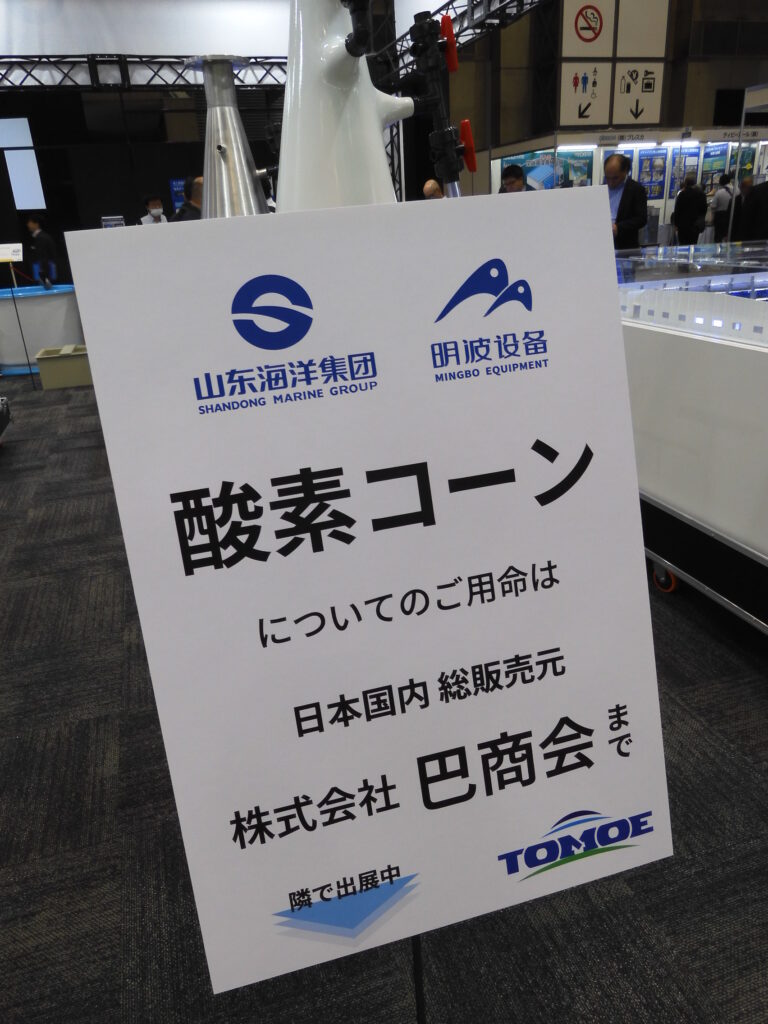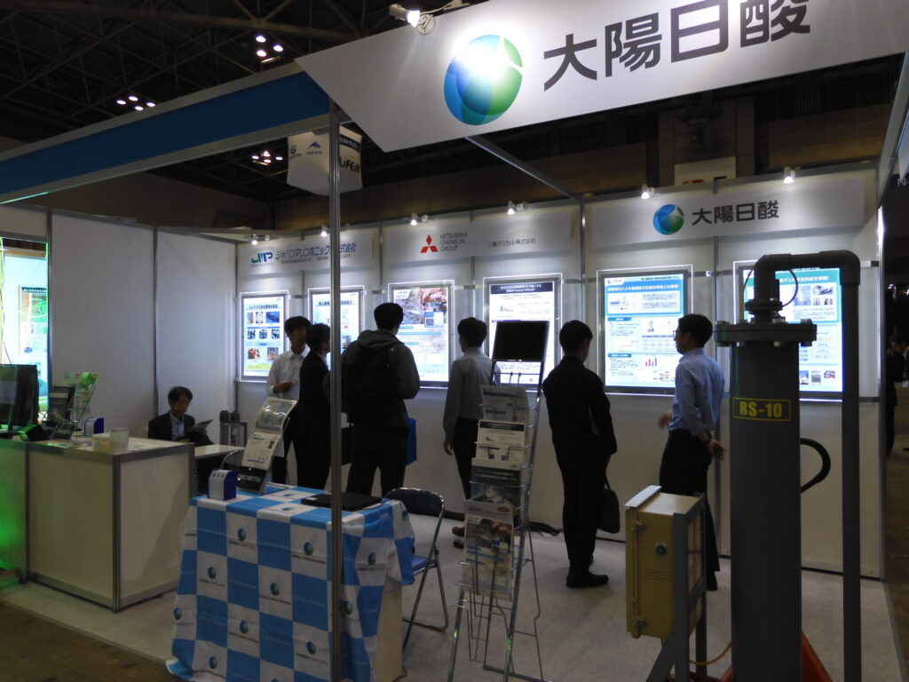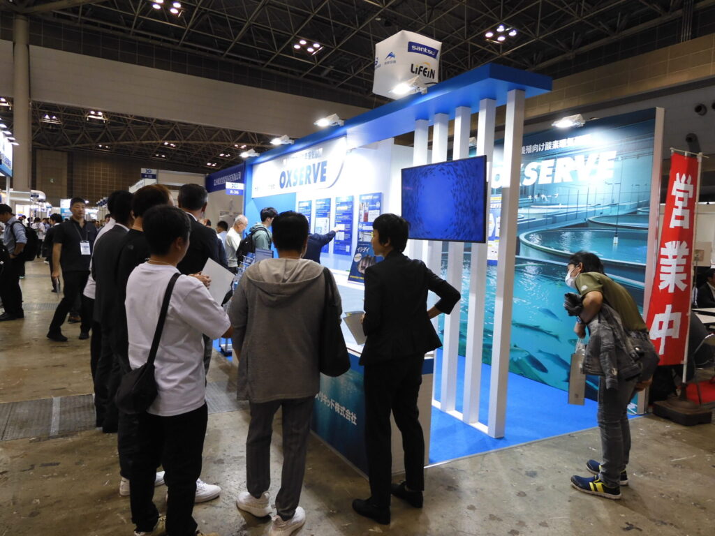 大陽日酸はグループ会社の三菱ケミカルや閉鎖型陸上養殖設備の開発を行うJMPと共同ブースで出展し、高効率酸素溶解装置による生産向上や養殖設備・関連機器、脱窒材、乳酸菌混合飼料の紹介を行った。