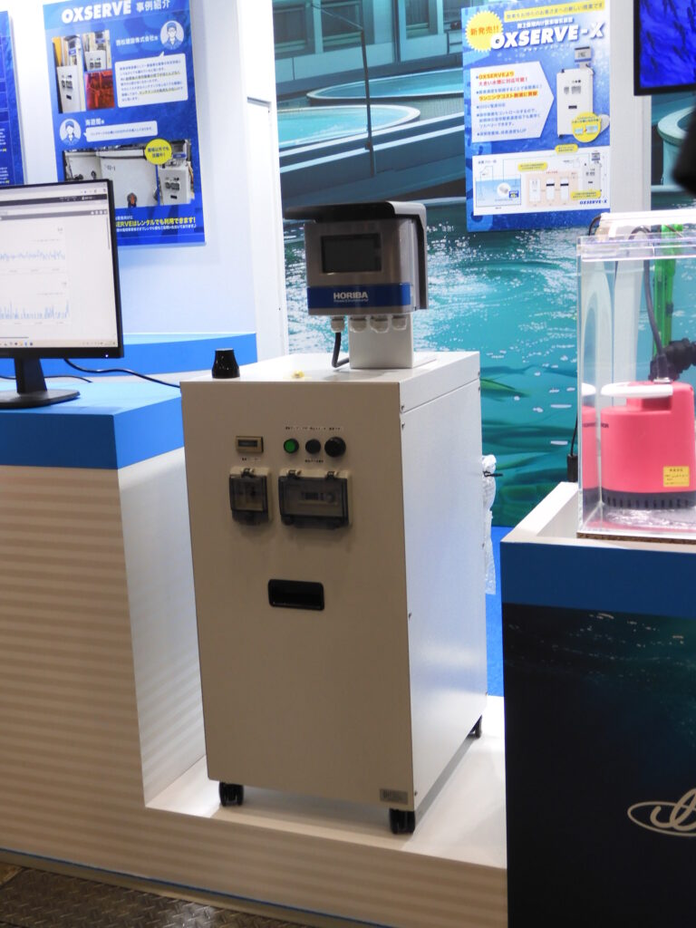 大阪ガスリキッドは、マイクロバブル発生ノズルを使用した陸上養殖向け酸素曝気装置「OXSERVE(オキサーブ)」に、PSAやCE、LGCなど酸素の供給源が既にある設備向けの新ラインナップ「OXSERVE-X」を出品して、より大型の水槽への対応や酸素濃度制御によるランニングコスト削減の提案を行った。