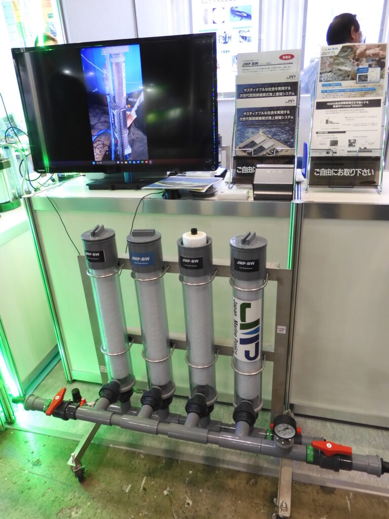 三菱ケミカルは完全閉鎖循環式の養殖を可能にする脱窒材「Forzeas DNA631」や、乳酸菌混合飼料・A飼料「飼料用ラクリス‐10」を出品した。JMPは飼育水槽中の1㎛以上の残餌や魚の糞などを効率よく濃縮し排出する逆洗式フィルターユニット「JMP-BW」シリーズを紹介した。