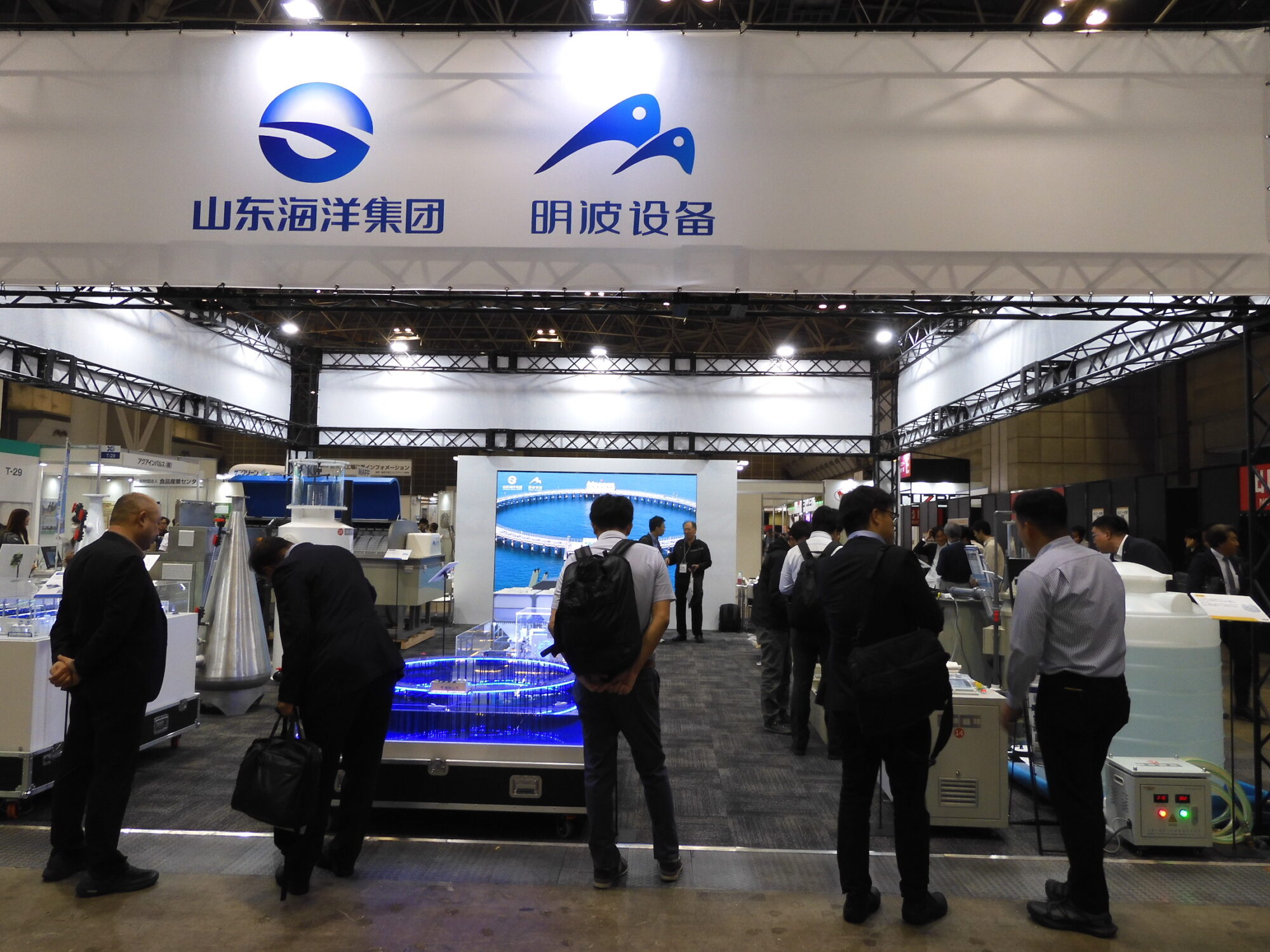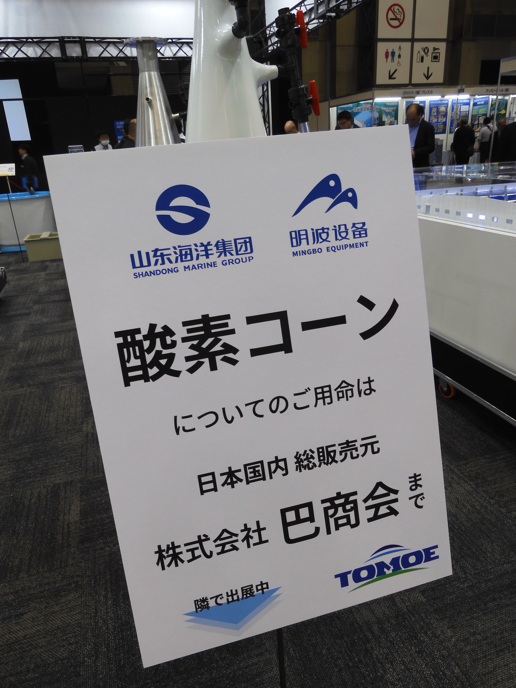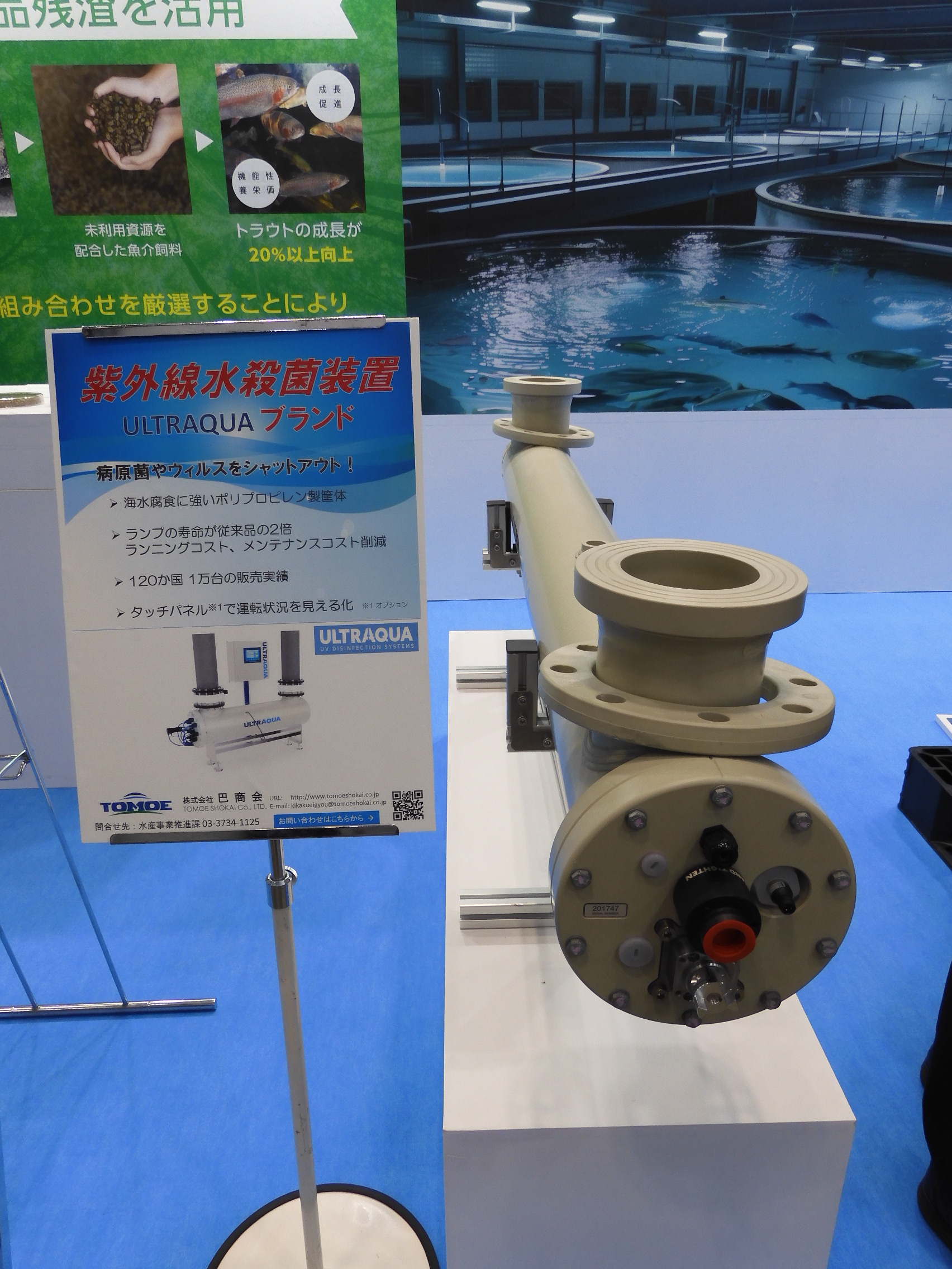 魚種・養殖環境の選定から、設備の設計・施工、魚の飼育指導や輸送・販売までをトータルでサポートする巴商会は、LGCによる酸素ガス供給装置や国内総販売元になる中国・山東明波海洋設備有限公司の酸素溶解装置「酸素コーン」MBシリーズ、東芝ライテックのUV水殺菌システム「ULTRAQUA」非腐食性PP/PEHDシリーズ、FRP円形水槽、コンパクト型機械式ろ過フィルターなどを展示した。