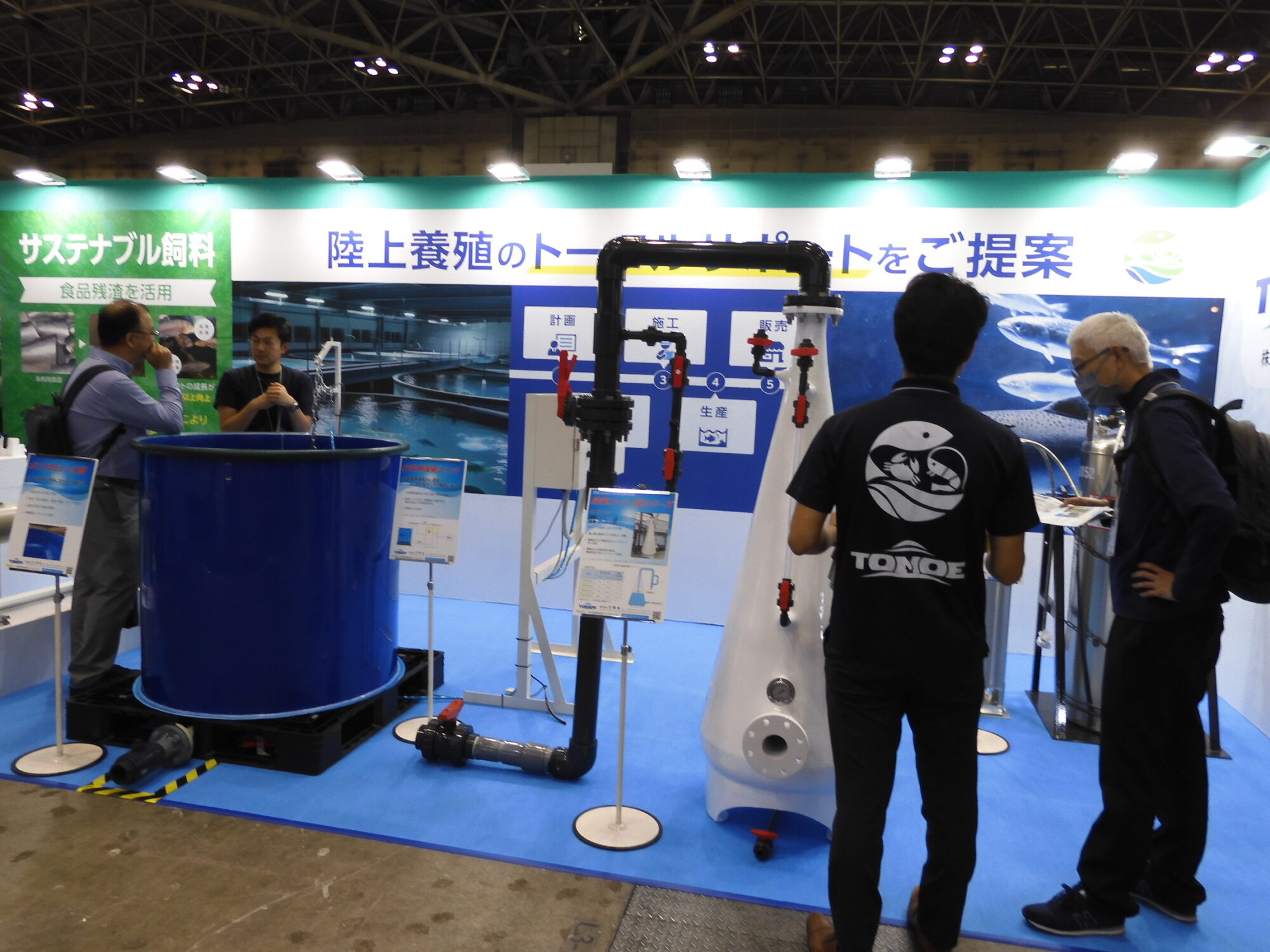 大陽日酸はグループ会社の三菱ケミカルや閉鎖型陸上養殖設備の開発を行うJMPと共同ブースで出展し、高効率酸素溶解装置による生産向上や養殖設備・関連機器、脱窒材、乳酸菌混合飼料の紹介を行った。