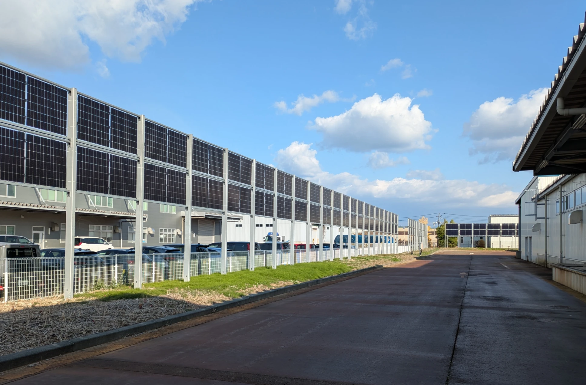 VERPAは、豪雪地帯や屋根構造の制約、敷地の狭さなど、従来型太陽光発電設備の導入が難しかった事業所でも設置可能で、敷地境界線沿いや駐車場、緑地内、通路脇などに幅2.5mのスペースがあれば施工できる。さらに、パネルは地表から2m以上の高さに設置するため、安全柵やフェンスが不要で、設置場所を他用途と共用できる点も特徴。