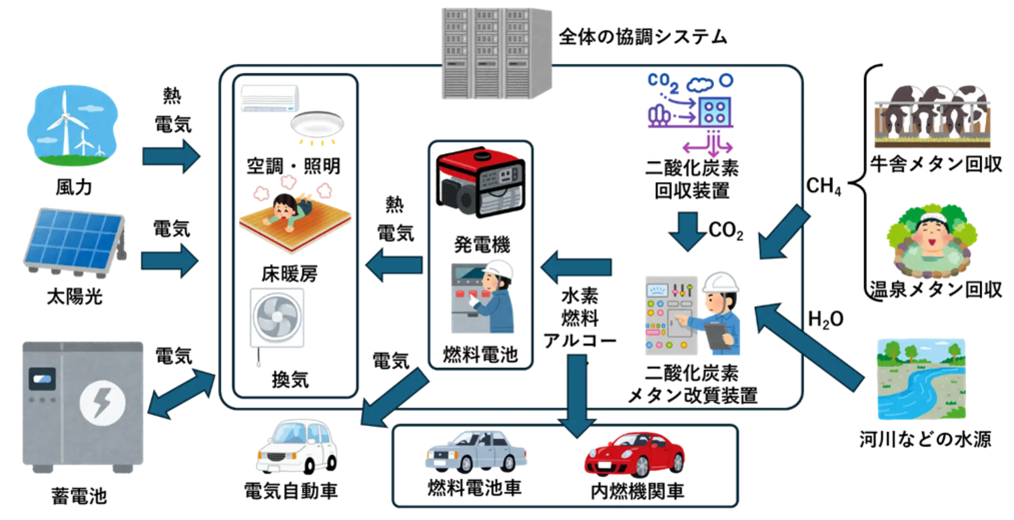 北見工業大学は、美幌町実証実験住宅で「『地域社会・経済の発展』と『地域の炭素資源の有効活用』の両立による『地域共生カーボンリサイクル』の実現」を目標に「温室効果ガスの回収・資源化およびエネルギーの効率利用」に向けた研究に取り組んでいる(図2)。