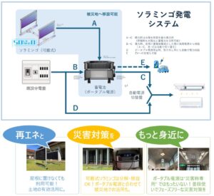 ▽山陰酸素工業が安来市と垂直型太陽光発電ソラミンゴとポータブル電源の発電システム実証を開始