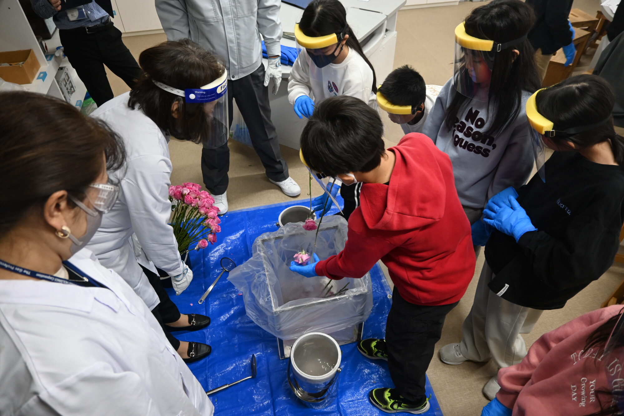 実験は、大陽日酸の社員が講師を務め、バラの花やゴムボールの凍結実験、風船に入った気体を冷やす実験、超電導コースターの実験、白煙を発生させる実験の全4 種類を実施。日常生活では体験できない現象を間近で観察し、科学の面白さや不思議さに触れることで、理科への興味を高める貴重な機会となった。