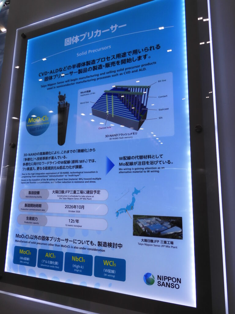 この中で、CVD・ALDなど半導体製造プロセス用途で使用される固体プリカーサーとしてMoO2Cl2(Molybdenum dichloride dioxide)の製造設備を新たに大陽日酸JFP三重工場に建設し、2026年10月に製造を開始、生産能力12t/年を予定することを明らかにした。