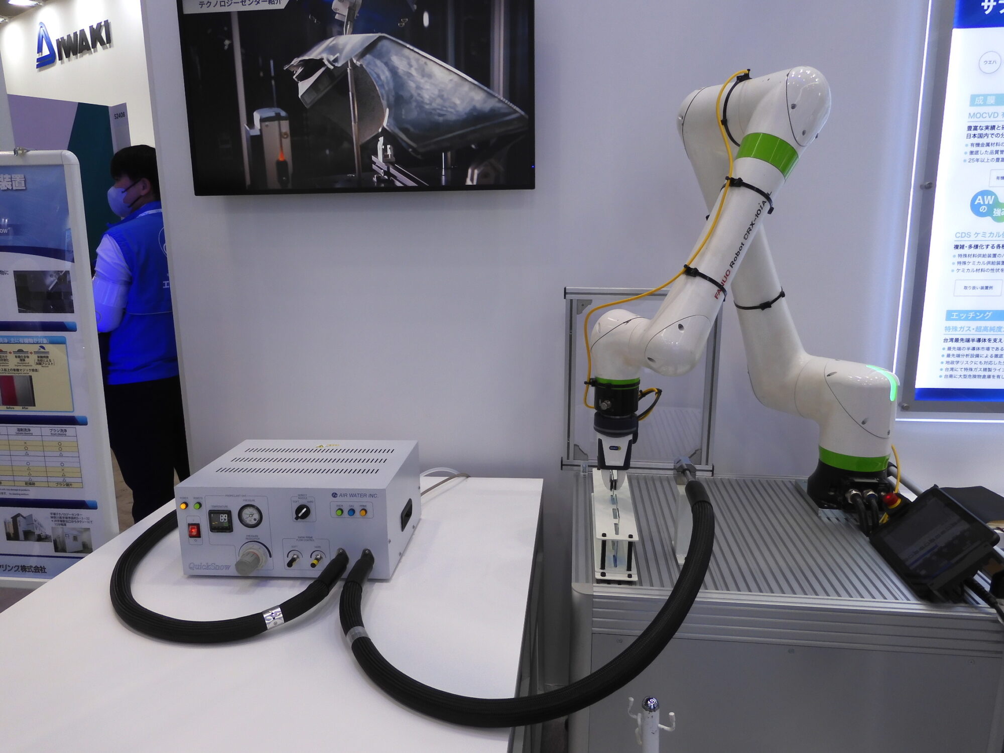 ブースでは、QuickSnow(ドライアイススノー精密洗浄装置)の実機を展示し、ロボットハンドとの協働による自動洗浄のデモを実施、微粒ドライアイスでミクロン単位の汚れも瞬時に洗浄する、最先端の技術を披露した。ウエハのダイシングカット後の切削粉除去やイメージセンサー上のパーティクル除去、電子部品のレーザーカット後の煤等の除去、自動車ボディ部品の塗装前洗浄などの分野で導入実績がある。