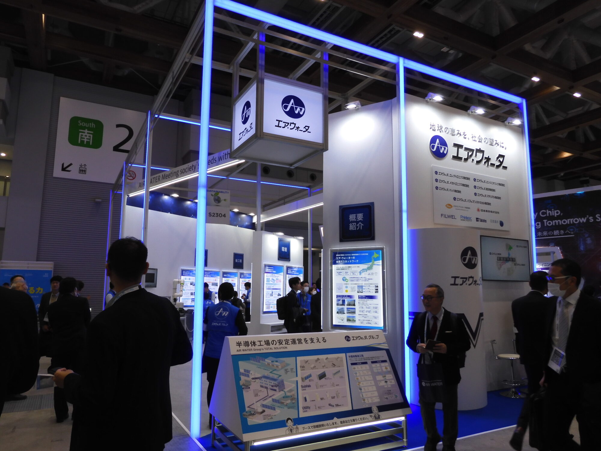 エア・ウォーターは、エア・ウォーター・エレクトロニクス、エア・ウォーター・エンジニアリング、エア・ウォーター・パフォーマンスケミカル、エア・ウォーター防災、エア・ウォーター・マッハ、エア・ウォーター・マテリアル、エア・ウォーター・メカトロニクス、タテホ化学工業、日本海水、日本電熱、FILWEL、プリンテック、メカトロ・アソシエーツのグループ14社で「半導体工場の安定運営を支える」トータルソリューションをプレゼンテーションした。