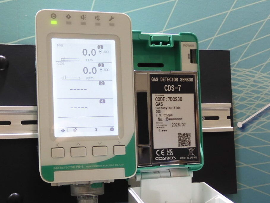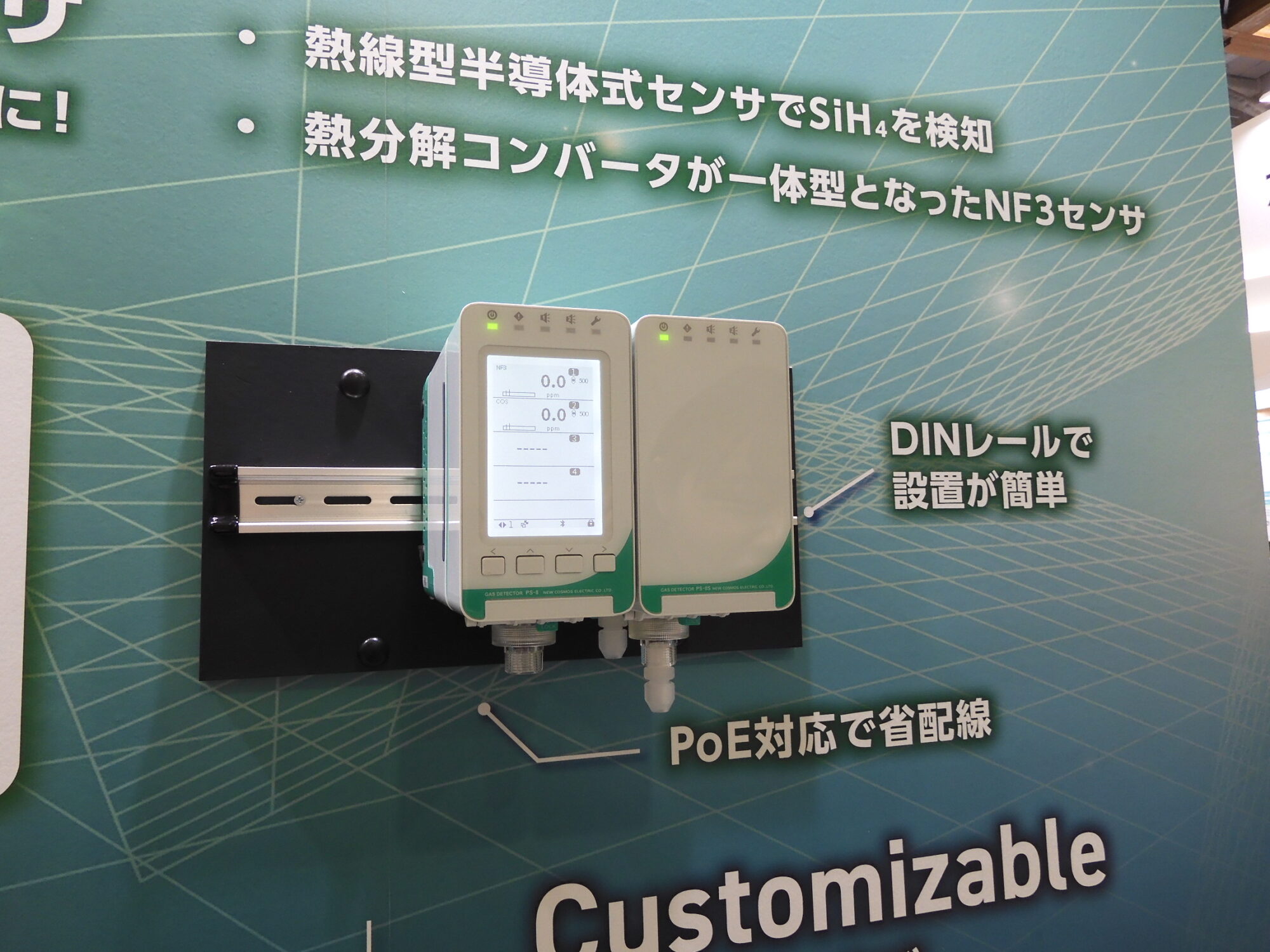 新コスモス電機は、半導体工場向けガス検知警報装置用コスモス式ガス検知部「PS-8シリーズ」を展示。新しくなった硫化カルボニル(COS)センサによる独自の触媒技術で熱分解コンバータを内蔵、パージフィルタ不要になり省スペース化した。大型液晶で視認性が高くPoE対応で省配線、メインユニット1台で最大16点のセンサ情報を表示する。