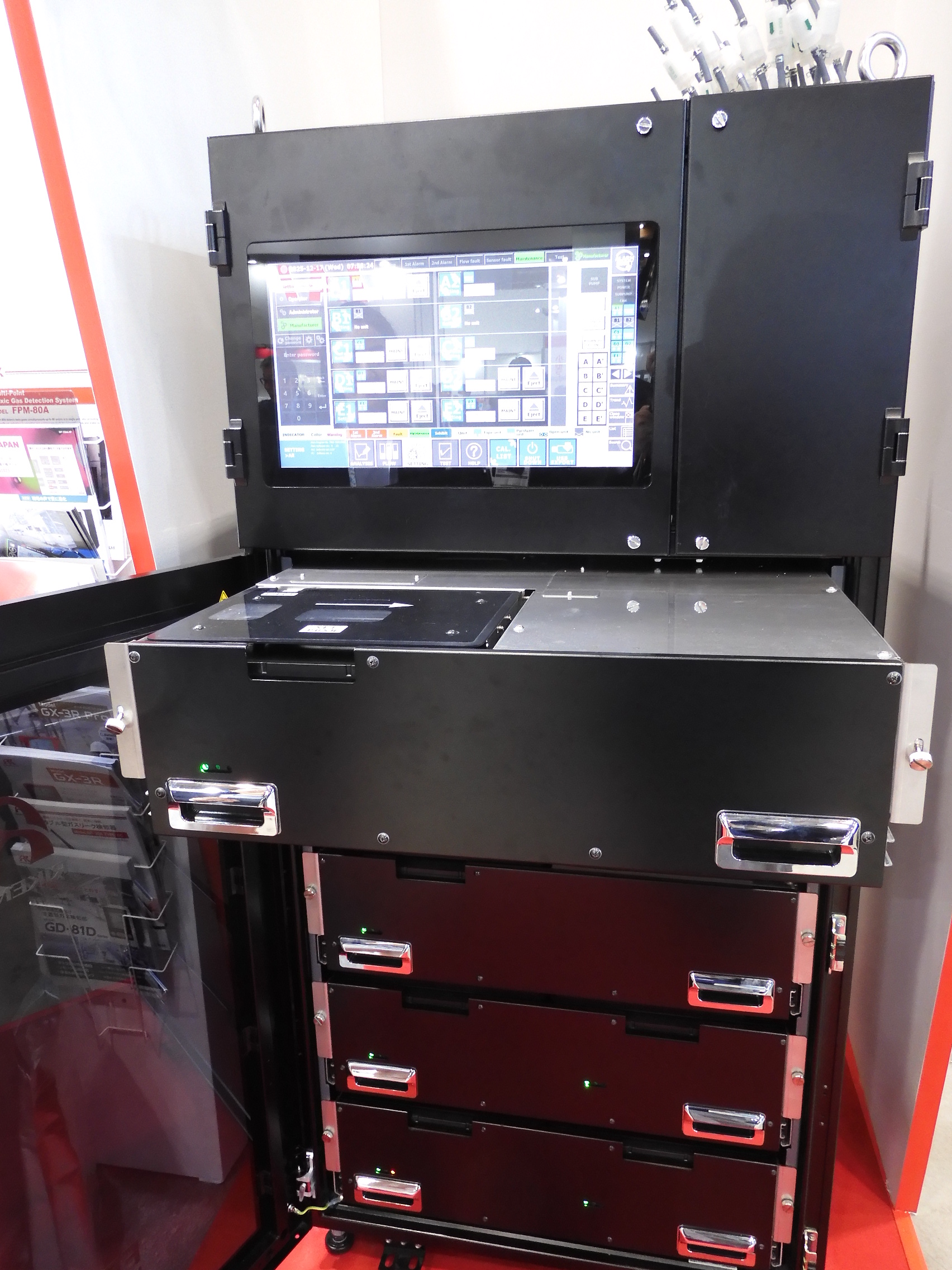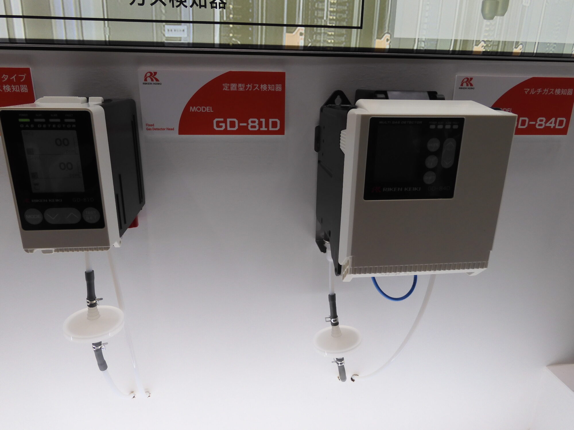 理研計器は、新製品の定置式ガス検知器「GD-81Dシリーズ」を初出展。「GD-70Dシリーズ」のアップグレードモデルとして開発され、従来器からのリプレイスを考慮しながら、新たに毒性ガスの2成分同時検知を実現し、設置スペースや配管・配線施工コストを削減する。一台で最大4種のガスセンサを搭載可能な定置式ガス検知器「GD-84D」やブラウザベースのガス漏洩監視システム「監視郎Ⅱ」も紹介、海外向けの検知テープ式多点毒性ガス検知システム「FPM-80A」の実機も展示した。