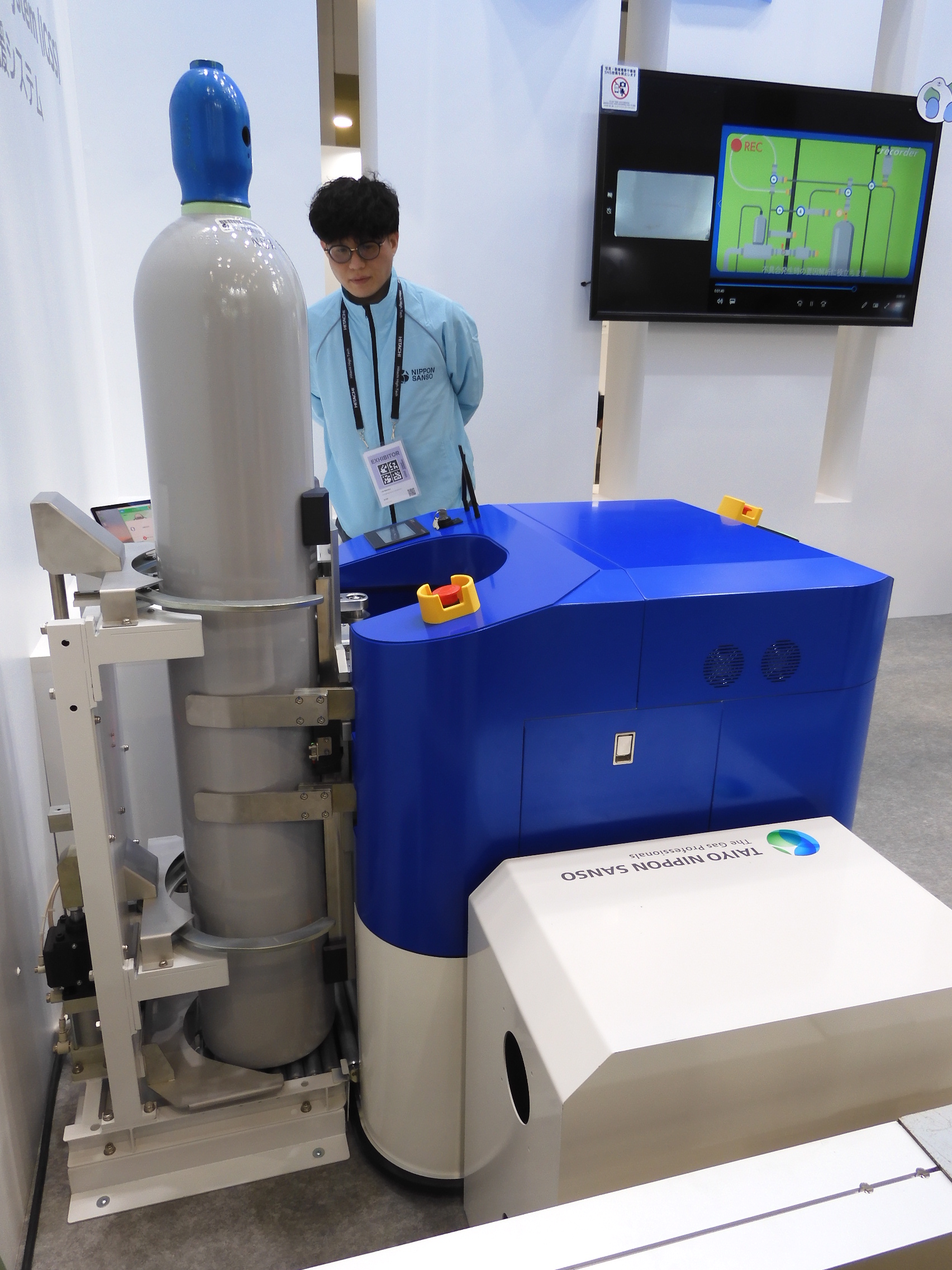 大陽日酸は、半導体製造工場の生産性向上に向けたソリューションとして、「Intelligent Gas Supplying System(IGSS)」を提案。システムを構成する機能の1つ「Cdrive」の実機を展示して、最大 100kgもあるガス容器を容器保管庫からガス消費設備まで搬送し、シリンダーキャビネット内で容器の出し入れを自動で行うデモ走行を実施した。そのほか、2025年6月から開始した特殊ガス製品輸送の鉄道輸送によるモーダルシフトや、つくば開発センター内への「エレクトロニクス先端材料開発棟」の建設を含む、先端半導体プロセスに特化した半導体材料ガスやガスハンドリング機器製品を紹介。また、CVD・ALDなど半導体製造プロセス用途で使用される固体プリカーサーとしてMoO2Cl2(Molybdenum dichloride dioxide)の製造設備を新たに大陽日酸JFP三重工場に建設し、2026年10月に製造(生産能力12t/年)を開始することを発表した。