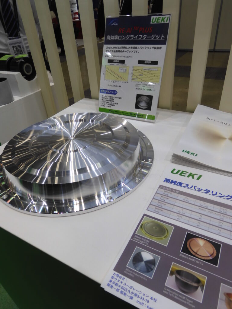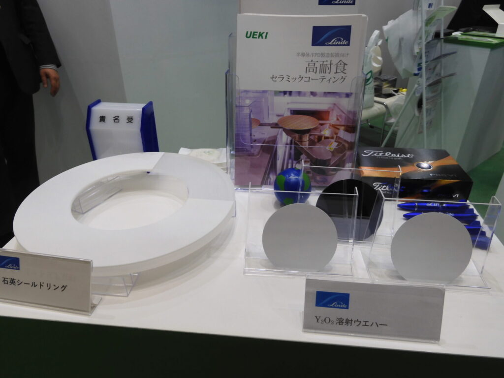 間もなく創業90周年を迎えるウエキコーポレーションは、国内総代理店となるリンデ社製の高純度スパッタリングターゲットや半導体製造装置向けのプラズマ溶射処理の表面改質技術を展示。リストバンド型センサ「MULiSiTEN(東芝製)」とビーコンタグによる位置検知システムの作業員の現在地表示デモや、自社製品のボンベバルブ自動開閉器「BVC」の提案も行った。