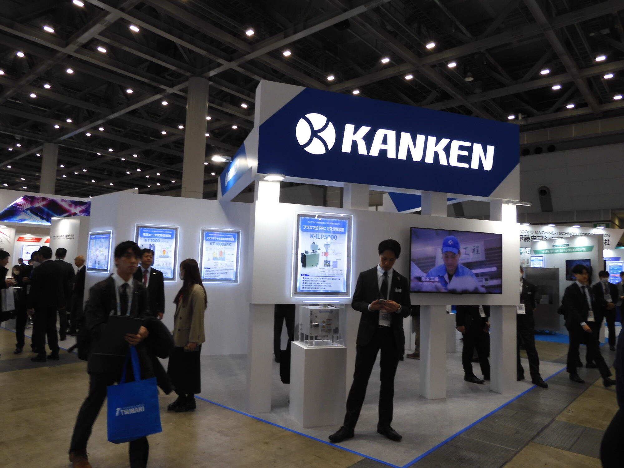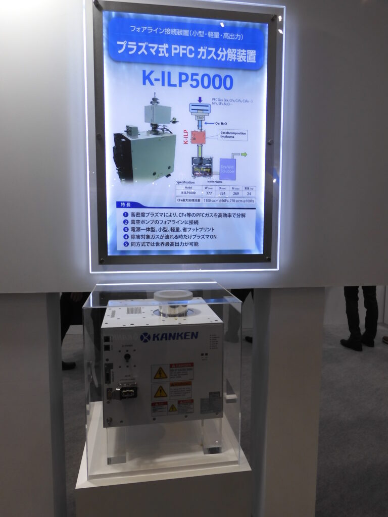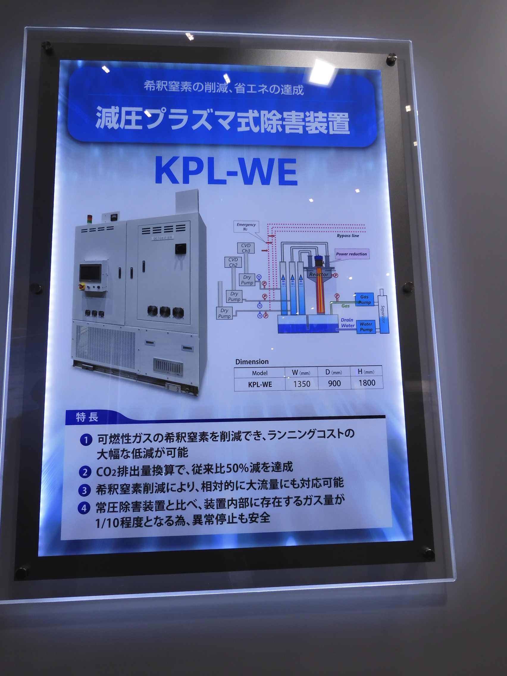 半導体向け排ガス除害装置のカンケンテクノは、環境に優しい電気ヒータ式とプラズマ式除害装置のパネル展示を行った。地球温暖化係数がCO2の数千倍以上となるPFCガス分解装置の提案として、真空ポンプのフォアラインに後付け可能な小型・軽量・高出力なプラズマ式PFCガス分解装置「K-ILP5000」の実機を展示。2024年度省エネ大賞最高位「経済産業大臣賞」を受賞したエキシマレーザガス回収精製装置や、開発中のヘリウム回収精製装置「Heリサイクラー」の紹介も行った。