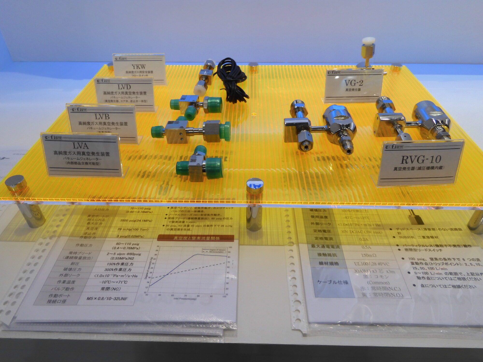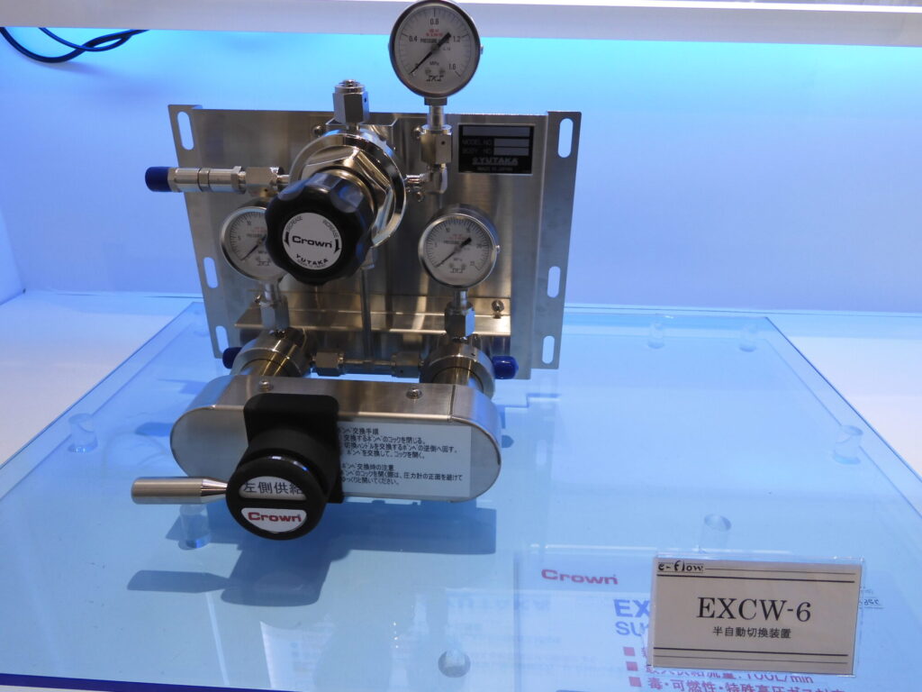 圧力調整器のユタカは、高精度2種ガス混合装置「BMFシリーズ」や高純度ガス対応圧力調整器、分析・研究用ガス対応機器を取り揃えた。SUS製半自動切換装置「EXCW6シリーズ」は、左右切換弁の同時操作による新切換方式を採用、最大供給圧力0.8MPaを実現することで「高圧ガス製造設備」対象外となる。最大供給流量100L/分、毒・可燃性・特殊高圧ガスに対応。また、高純度ガス用装置の流量スイッチや真空発生装置も紹介した。