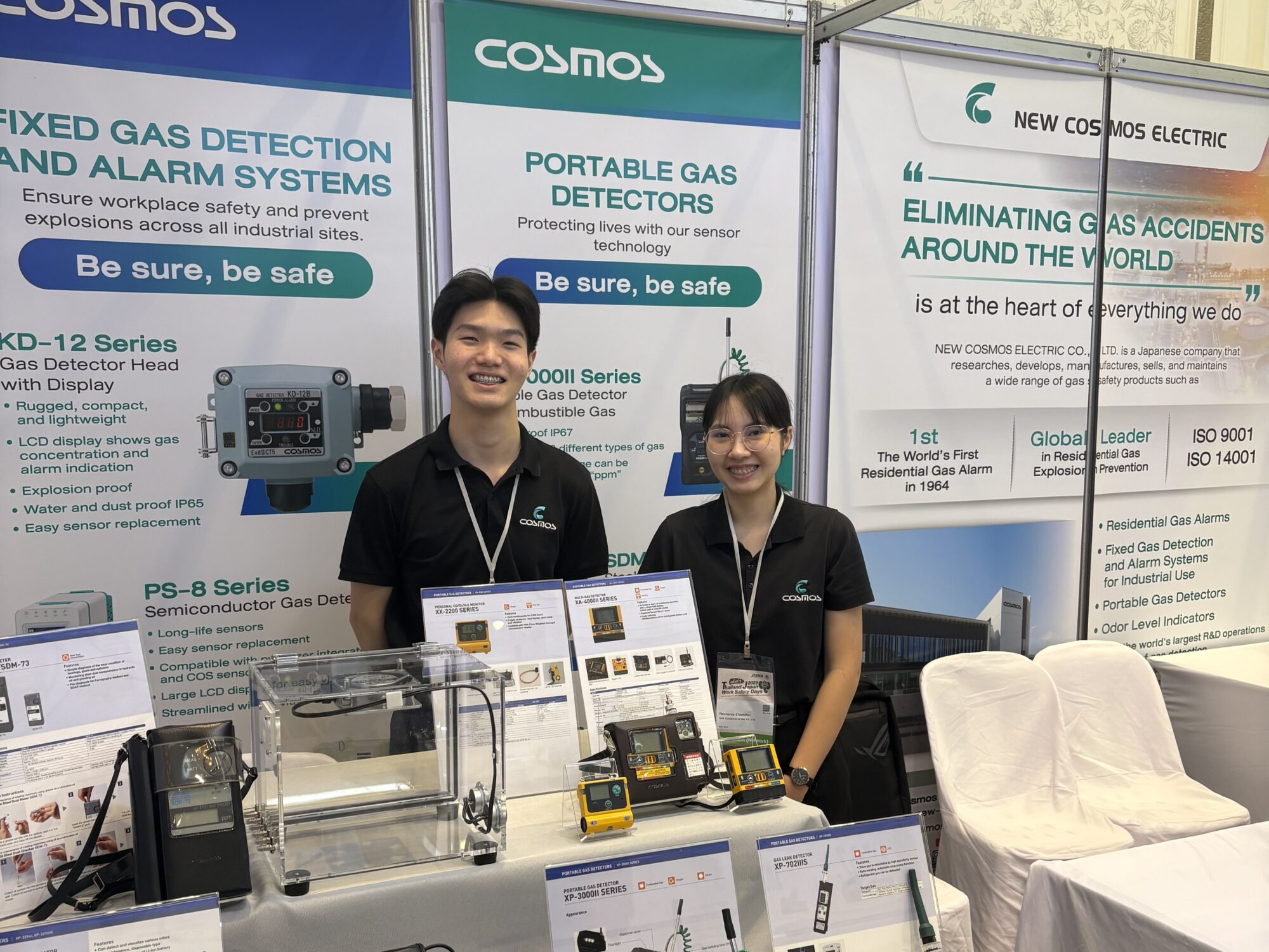 新コスモス電機は産業用ガス検知警報器をはじめとする安全関連製品を提供しており、2019年にタイ事務所を開設した。以降、現地の販売代理店と連携して販売・導入支援や保守サービスを行い、製造業や化学プラント、建設現場など、タイの多様な現場に安全ソリューションを提供している。また、タイ国内最大の労働安全衛生展示会「Thailand Safe@Work」に毎年出展し、労働安全の啓蒙活動にも積極的に取り組む。