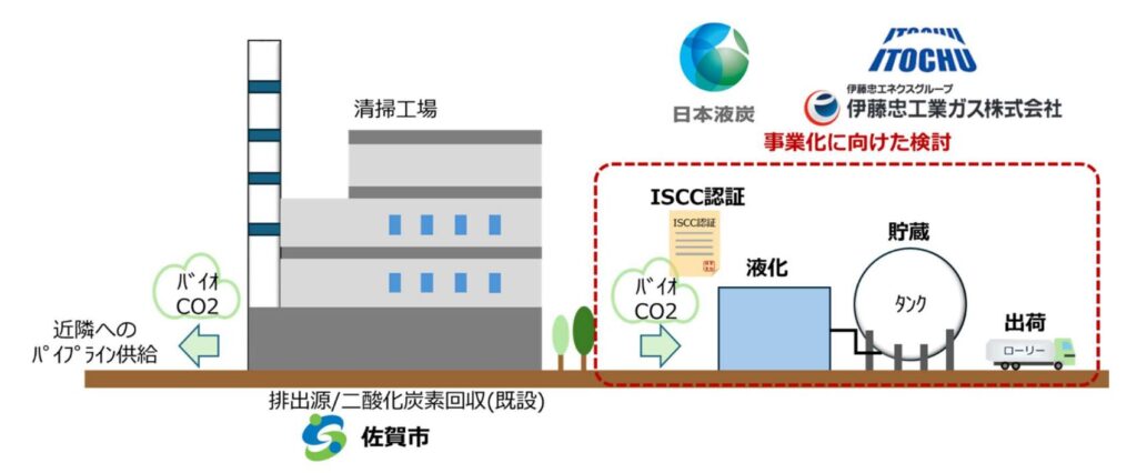 日本液炭は、佐賀市、伊藤忠商事、伊藤忠工業ガスと共同で、佐賀市清掃工場で回収されるバイオ由来二酸化炭素(以下「CO₂」)の液化・事業化にむけた可能性を検討するため、「バイオ由来 CO₂の液化事業化に向けた共同検討に関する覚書」を締結した。