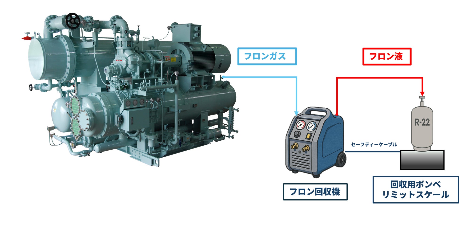 冷凍機メーカーとしてのノウハウを活かし、他メーカーの大型スクリュー圧縮機やターボ冷凍機などに使用されるフロンの回収、充填、破壊処理、漏洩点検といった、有資格者作業に対応。