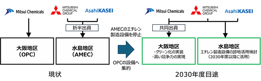旭化成と三井化学、三菱ケミカルの3社は、西日本に各社が保有する全2基のエチレン製造設備について、新たに3社で共同事業体を設立の上、2030年度を目途に三菱ケミカル旭化成エチレン株式会社(以下、AMEC)水島工場のエチレン製造設備(所在地:岡山県倉敷市)を停止し、大阪石油化学株式会社(以下、OPC)の設備(所在地:大阪府高石市)へ集約することで合意、基本契約を締結した。